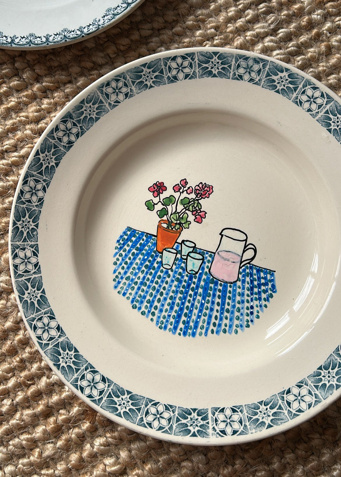 An illustrated vintage french ceramic shallow bowl/plate that will look lovely on the wall. I will provide a hanger for you!
