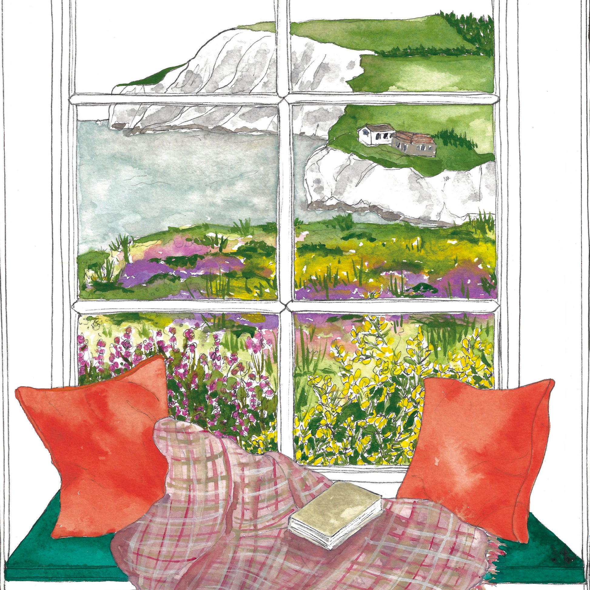 An art print of a window seat with a sea view, white cliffs and wild flower meadow in the Isle of Wight, UK.